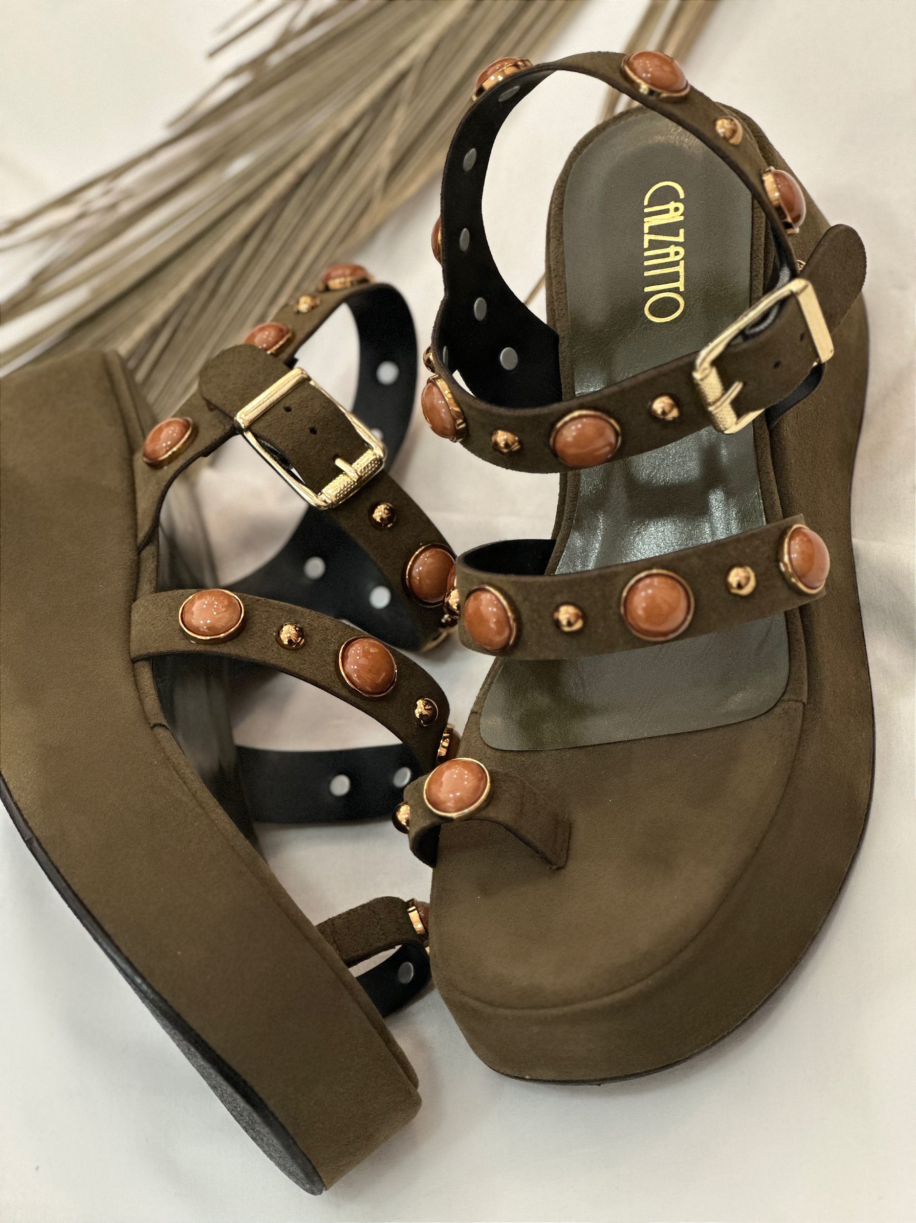 Anabela Anna Verde militar com detalhes em Caramelo