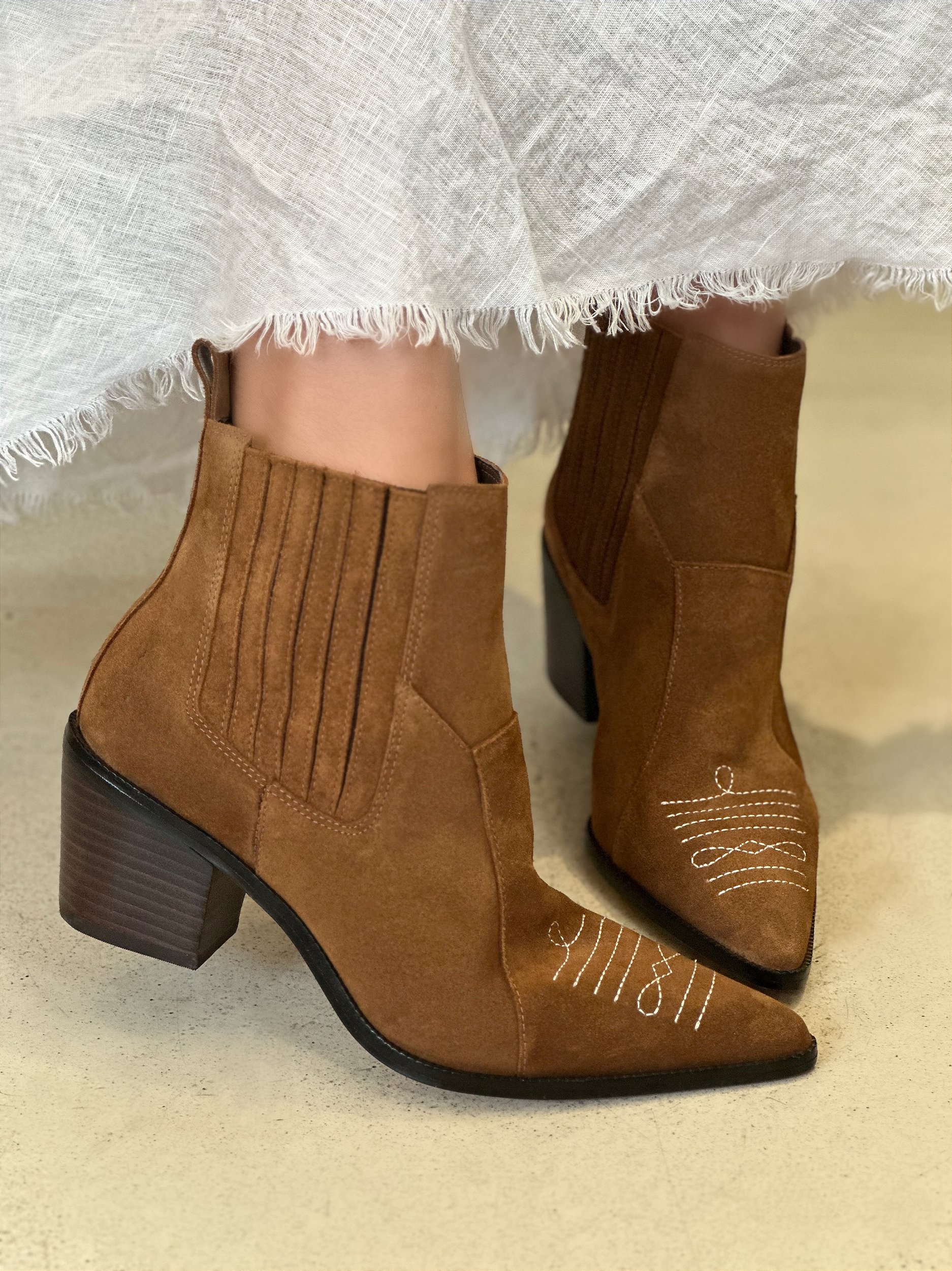 Material: Camurça encerada com pesponto western na cor branco e salto fachetado em couro