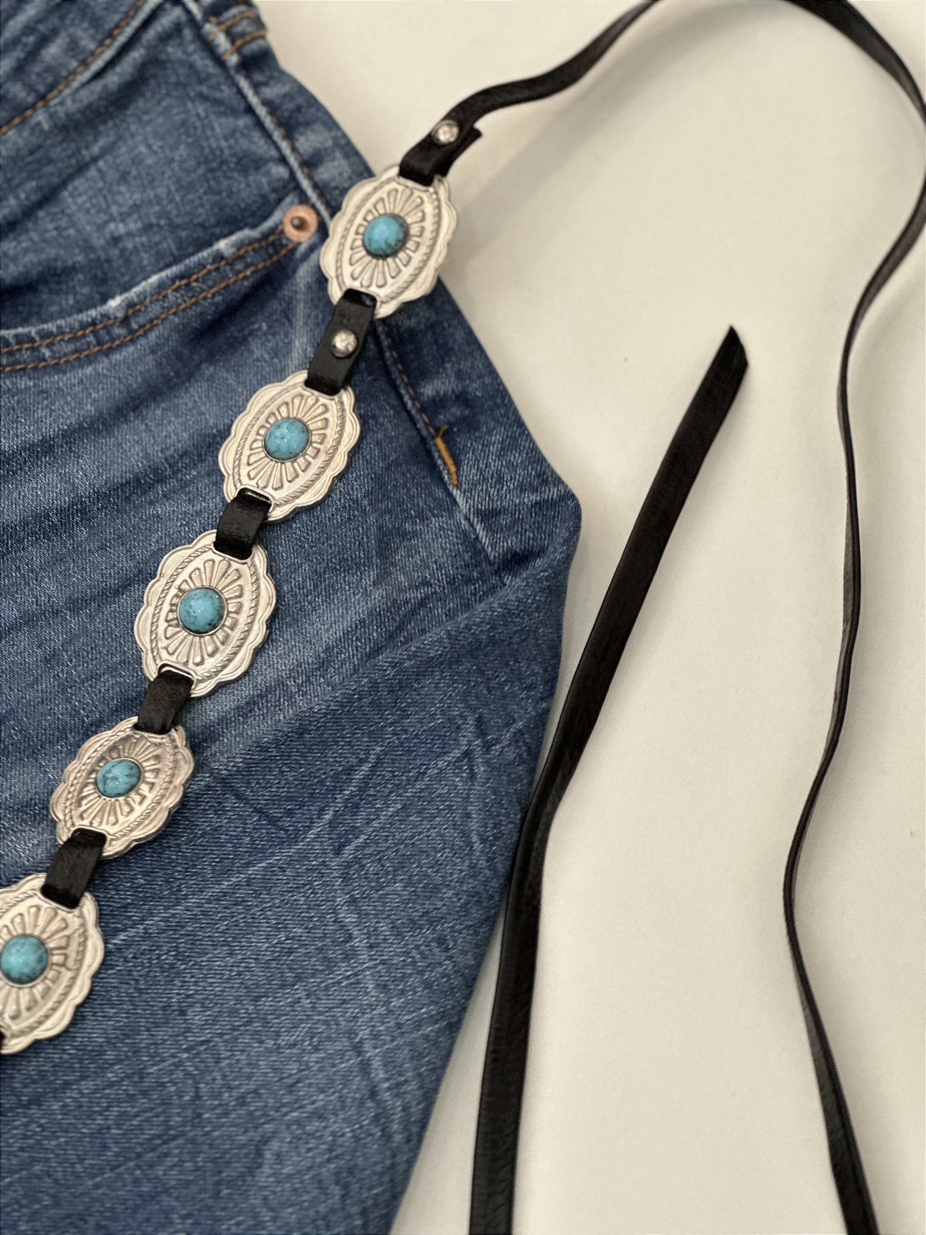 Cor: Preto com enfeites em prata e azul turquesa