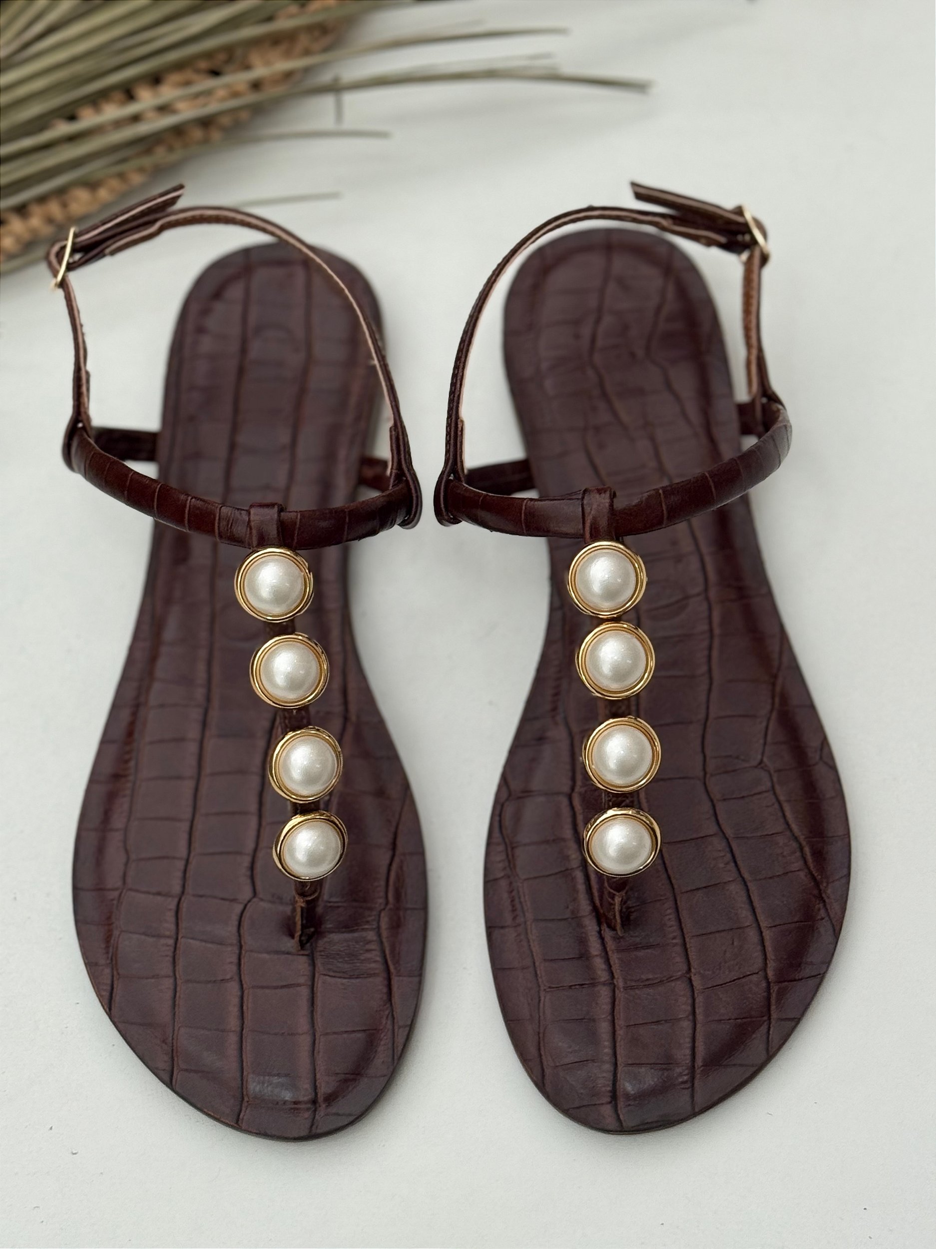Material: Couro legítimo Croco, palmilhas também em couro com detalhes em enfeites