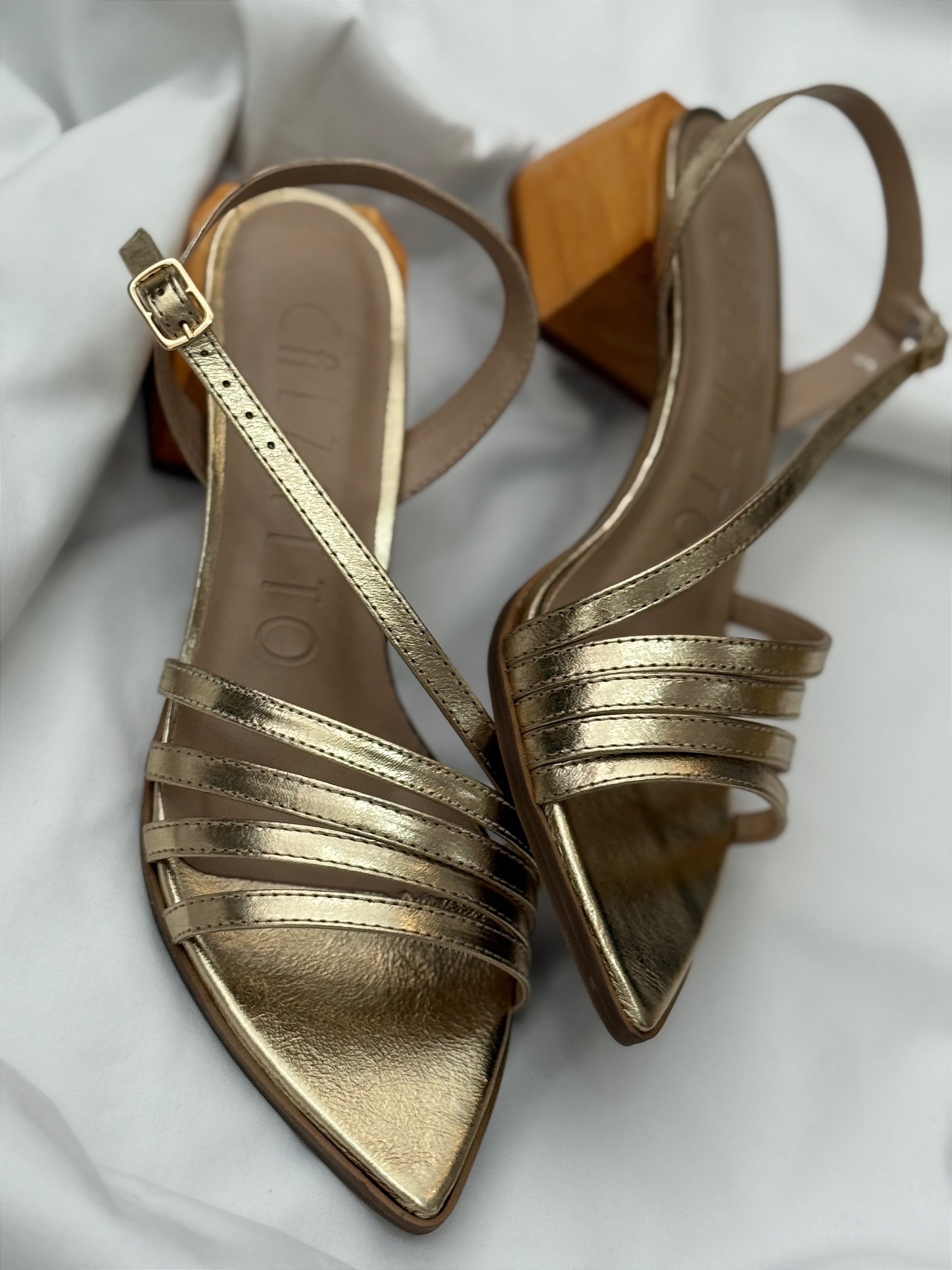 Material: Couro confort metalizado e salto de madeira
